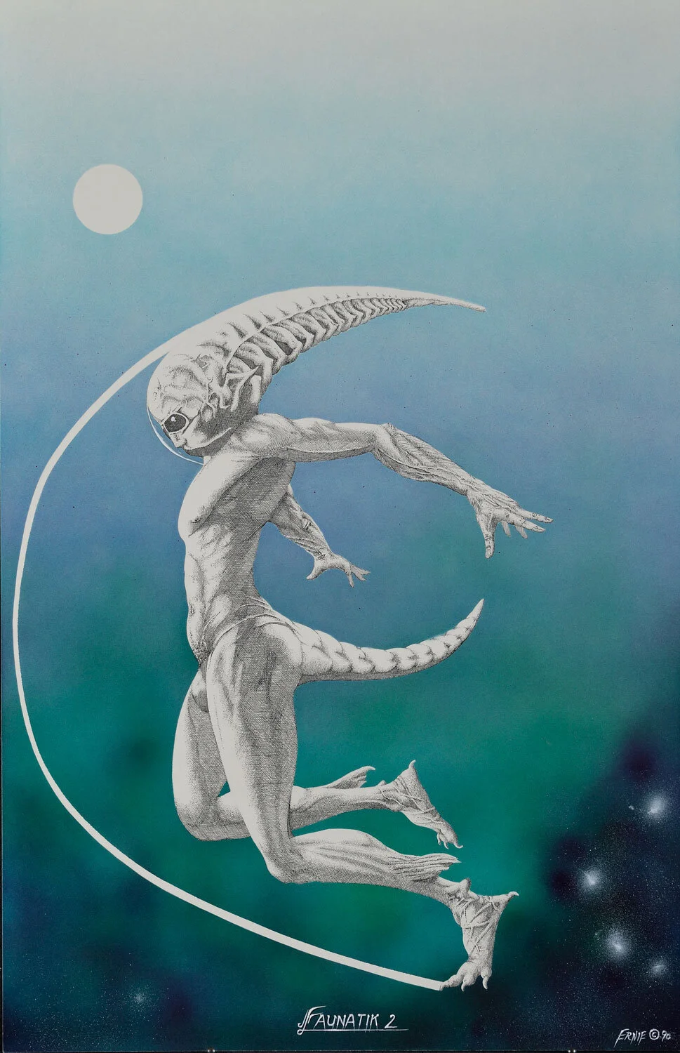 Fantasy Ikone Frank Frazetta gilt bis heute meine Bewunderung. Die ohnehin faszinierende Anatomie lebendiger zu gestalten. H.R. Giger’s Einfluß allerdings wurde mir zu stark. Um mich von der düsteren Umarmung zu lösen, besuchte ich den Schweizer Künstler 1999 in Zürich, und kehrte nach interessanten Gesprächen mit meinen Erkenntnissen nach Hause zurück, nicht ohne wichtige Details für zukünftige Werke im Gepäck mitzunehmen. Meine Bilder wurden dichter und brachten mir erstmals eigene Befriedigung. Und auch das Medium Tusche kehrte in mein Schaffen zurück”.
